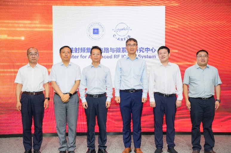 刘宇雷、郭永新、纪忠、李韬、潘益明和91沈先生 党委书记黄彬共同为先进射频集成电路与微系统研究中心揭牌。此次揭牌标志着研究中心建设迈入新阶段,中心将立足国家需求,聚焦核心技术,全面提升自主创新和成果转化能力。